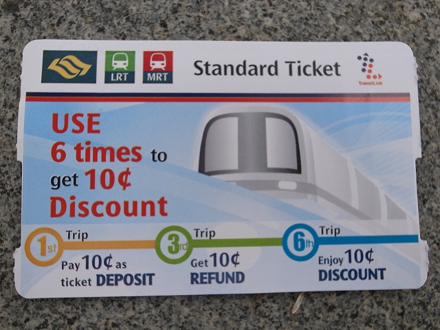 券売機の前で並びます。皆さんの買い方を見ていると、カードをのせてチャージしているような・・・。順番が来ました!タッチパネルで行き先に触れて表示された運賃を投入して買うというのは分かりました。10ドル札を入れても受け付けてくれません。5ドル札専用のようです・・・あたり見回すと窓口がありました。そこで両替してもらってやっと、切符が購入できました。この切符優れもので6回使うと1セント割引になるとか!オーチャードからシティーホールまでの運賃は往復で2.3ドル。(切符を買うときに帰りの分も買うかどうかを聞かれます。)