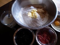 ・ストレート法でプルーンのコンポートも加えて生地を捏ねる。粉っぽさが無くなったらラムレーズンを加え、3倍くらいまで醗酵させる(一次発酵)。