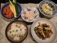 「よってけし」で買い物をした物の中に細たけのことベビーコーンがあります。これらは私はこの形で見るのは始めてです。タケノコは普通米ぬかで灰汁抜きして、料理しますけど、この細いたけのこは米ぬかや米のとぎ汁でゆがかなくてもお湯でゆがいてから調理すれば大丈夫と言われました。そんなわけで、細たけのこと、大根の葉を、牛肉と一緒に炒め煮にして1品。レッドオニオンのオニオンスライスとキタアカリを使ってのポテトサラダ。ベビーコーンは塩茹でして、新鮮なきゅうり、トマトはそのままでおいしい!ヘルシーなおかずと、この時期だけのグリンピースご飯・・・美味しかったですよ。