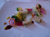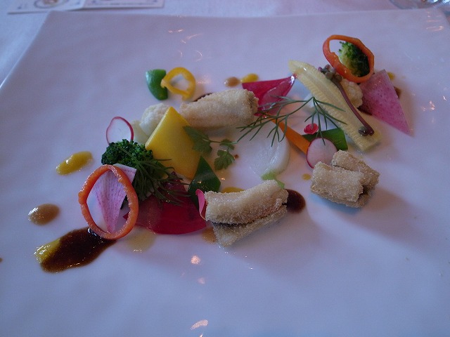 上の写真は「 アナゴのフリット&彩り野菜のッジャルディーヌ仕立て」です。(お味はもちろんおいしいですよ!色もきれいでしょ?!)
