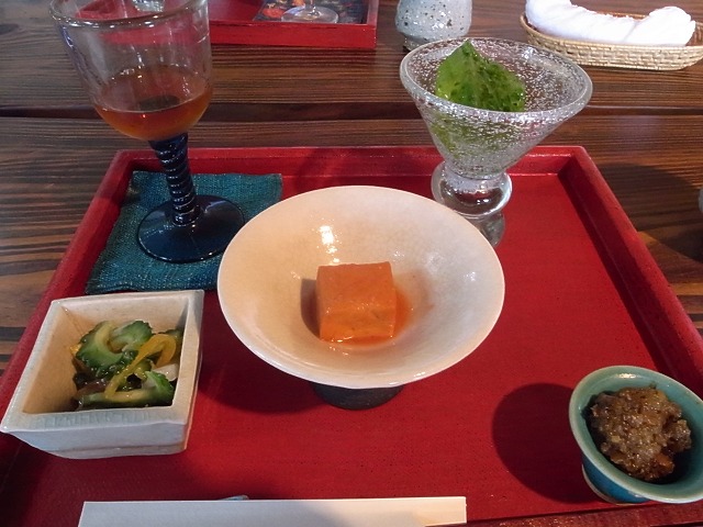 まず、赤い塗りのお盆に前菜が運ばれてきました。どれもおいしかったですが、私は紅麹で発酵させたという豆腐ようと自家製の米味噌、それと何も加えてない味のゴーヤゼリーがとても印象深く残っています。
