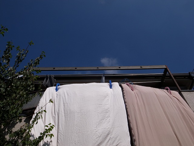 布団をベランダに干したまま、掛け布団カバーの紐?マジックテープ?(カバーの中で布団が偏らないように四隅とその中間に布団を固定させる紐が付いてますね)を結びます。もちろん布団を回して4辺全部。そして、最後にひっくり返してファスナーを閉めれば出来上がりです。