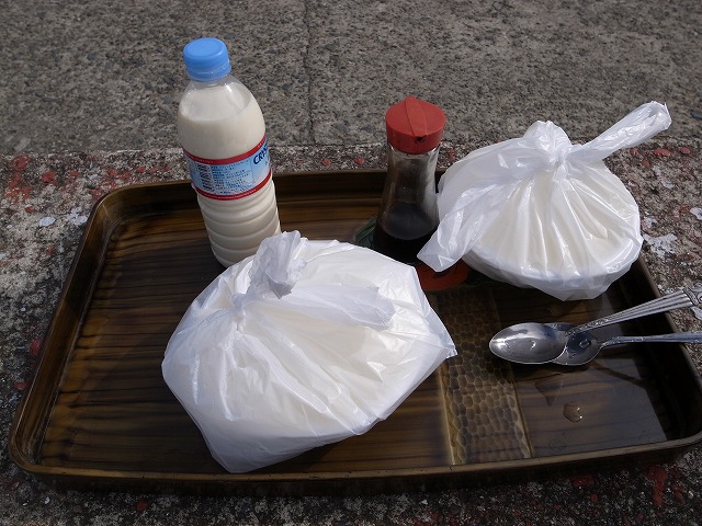 前もって電話してとっておいてもらうか、8時前に出向き、作業する前に分けてもらう。。。熱々の豆腐をごらんのようにお盆、にのせてしょうゆスプーンも用意してくれて、「裏の海辺で食べてきなさい」と言ってくれます!これも100円。豆乳も100円。